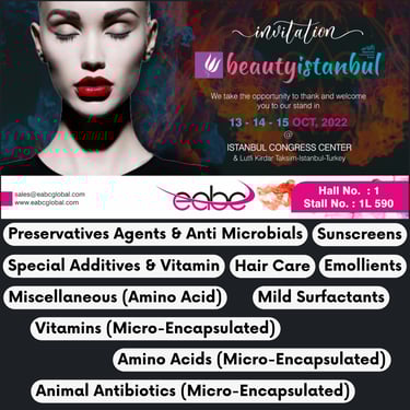 EABC GLOBAL invites you to our HALL NO. - 1 STALL NO. - 1L 590 at Beauty Istanbul on 13th to 15th OCT, 2022 ISTANBUL CONGRESS CENTRE, the Beauty Istanbul event dedicated to the beauty market of the Istanbul. We take the opportunity to thank and welcome you to our stand in 13-14-15 OCT,2022 ISTANBUL CONGRESS CENTRE. The exhibition will welcome the key players of the cosmetic industry.