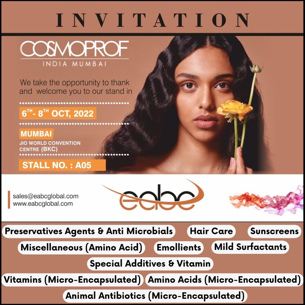 EABC GLOBAL invites you to our STALL NO - A05 at Cosmoprof India on 6th to 8th OCT 2022 MUMBAI, JIO WORLD CONVENTION CENTRE (BKC), the Cosmoprof event dedicated to the beauty market of the Indian peninsula, will be held from October 6th to 8th, 2022, at the Jio World Convention Center (JWCC) in Mumbai. The exhibition will welcome the key players of the cosmetic industry in India.